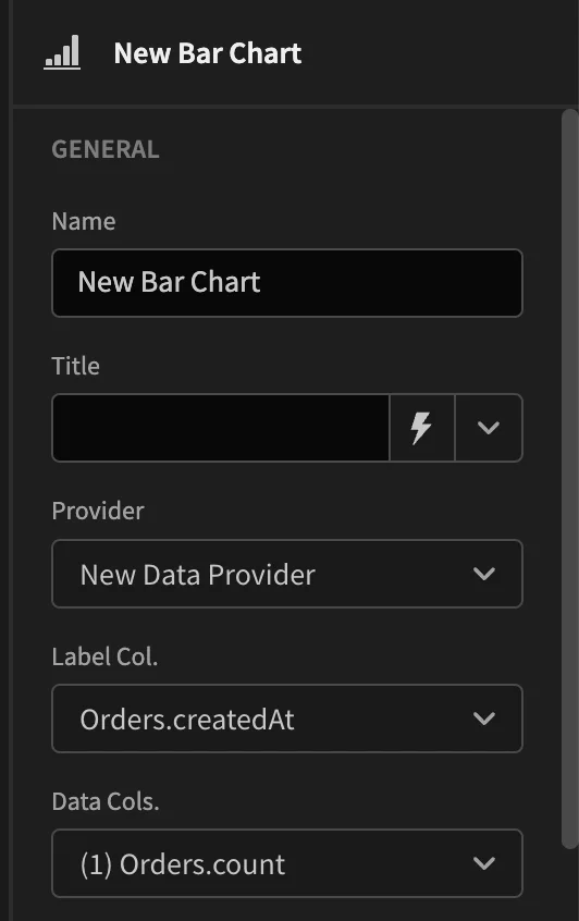 Then, you set the “label column” and “data columns”. In this sample you can set Orders.createdAt as the label column and Orders.count as the data columns.