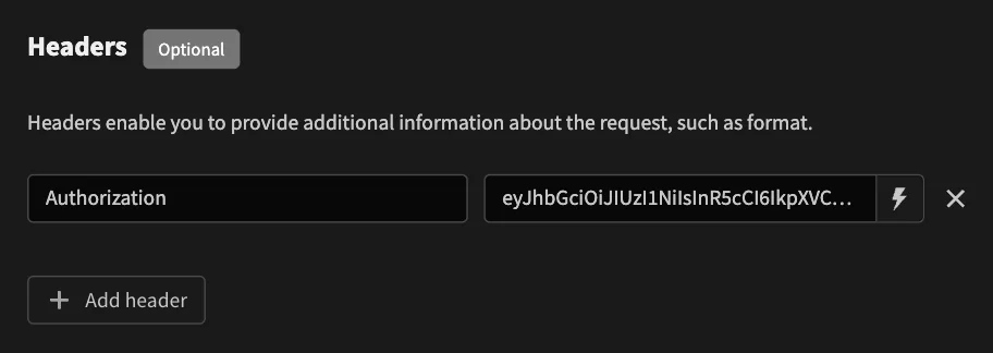 Next, add a “Authorization” header for the REST API. Copy and paste Cube’s Authorization token.