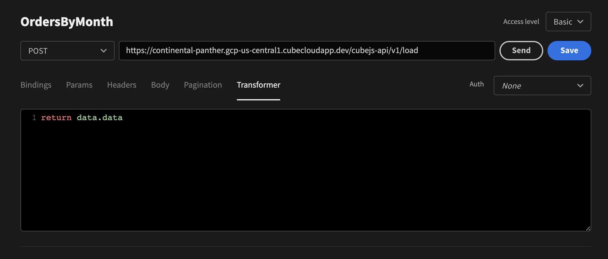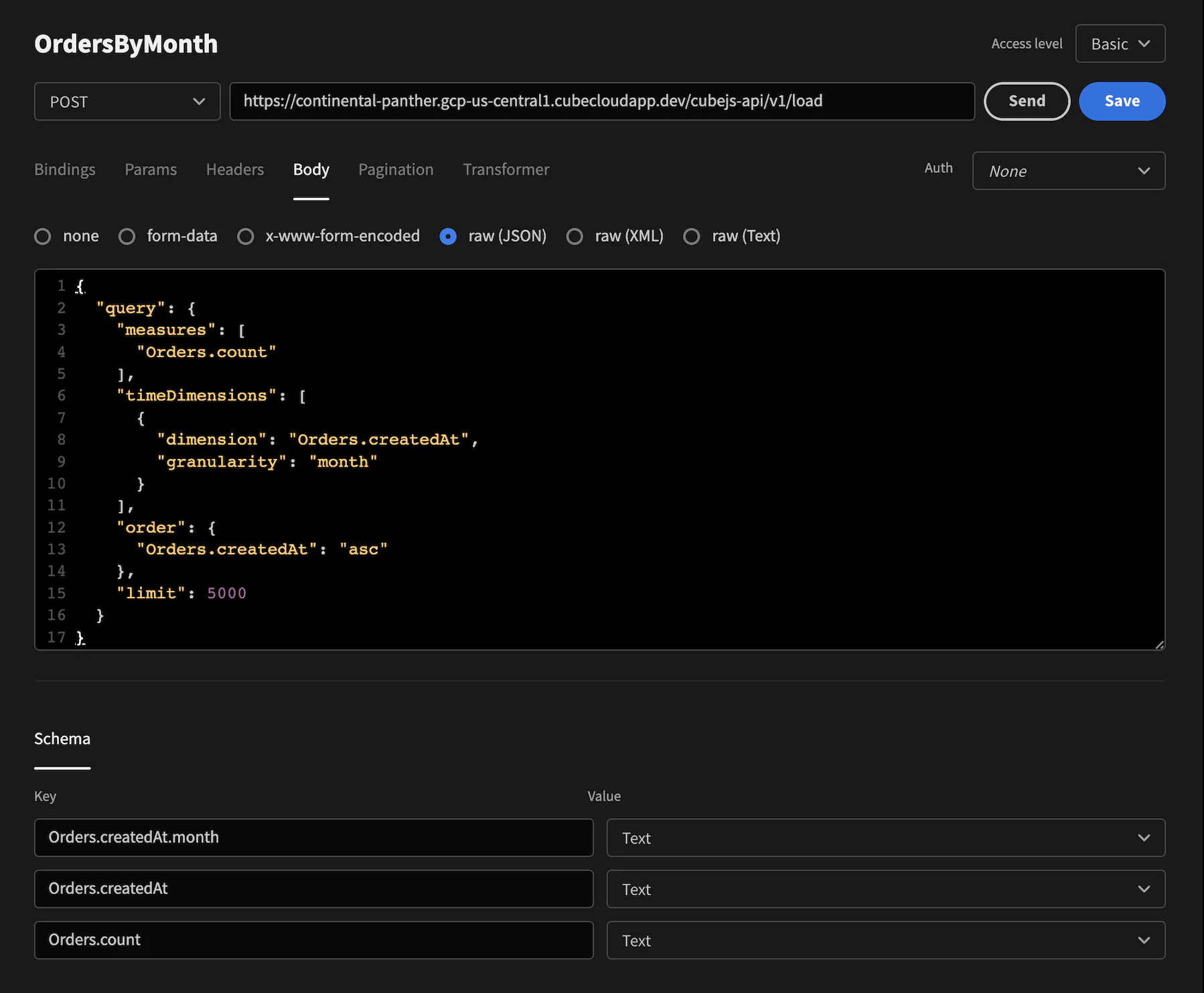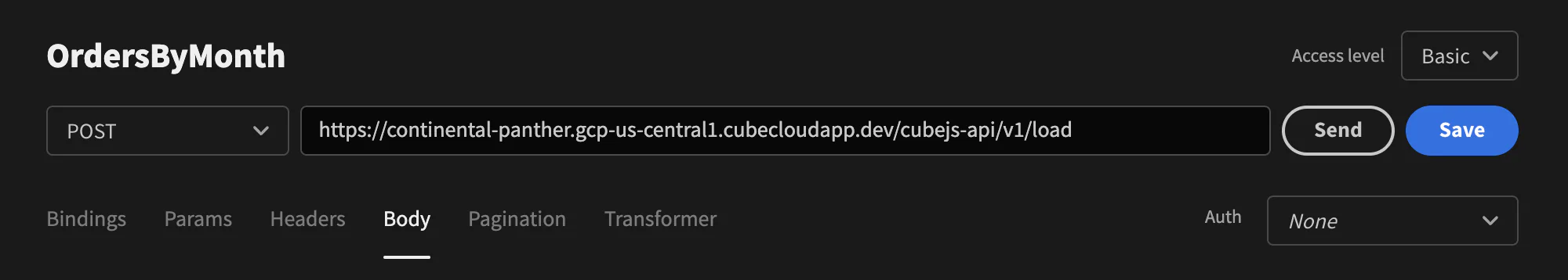 Copy and paste the Cube REST API, including the /load path, in the API field. Make sure to select “POST” as the request.