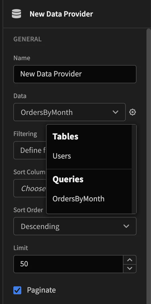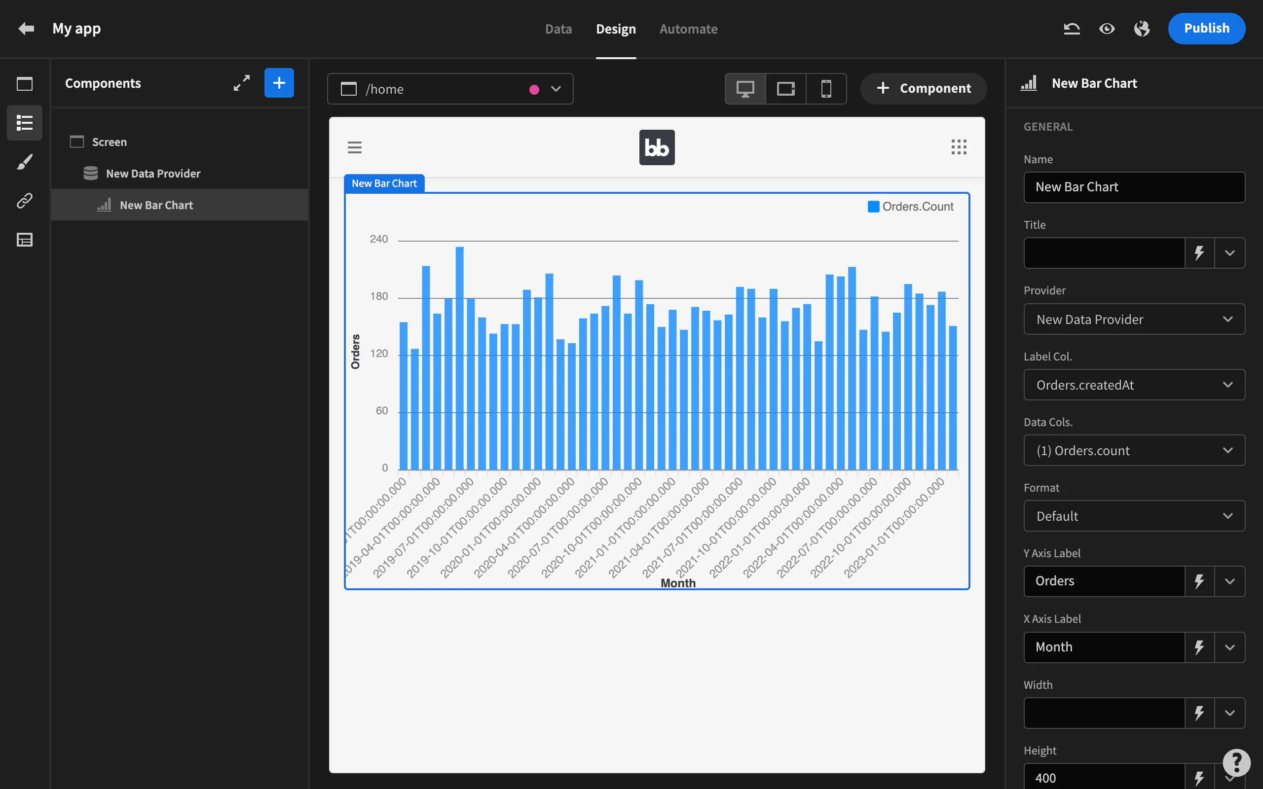 First, add a Data Provider. Select the query from above. In this sample it’s called OrdersByMonth.