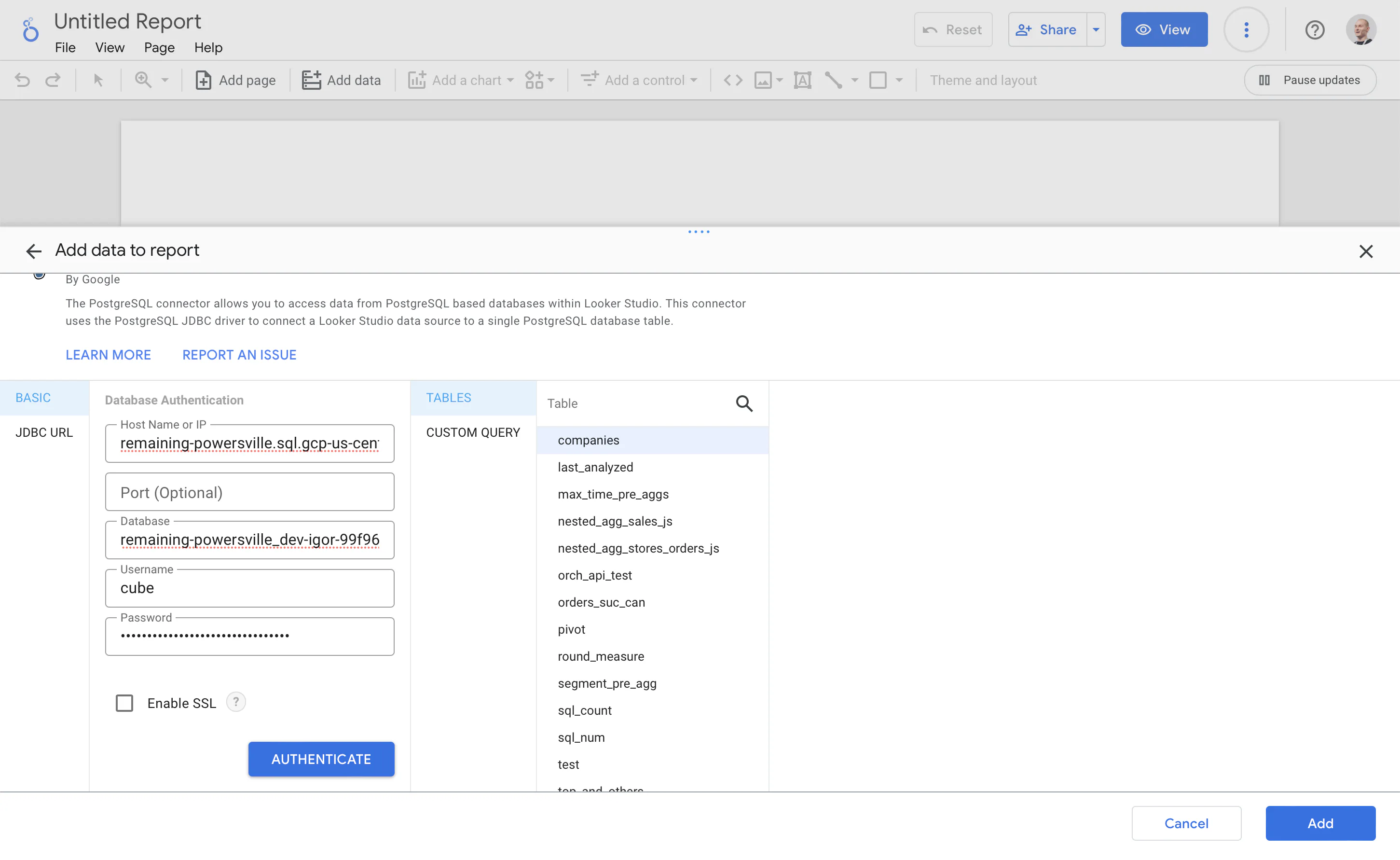 To connect to Cube, click in the tool panel, choose on the tab, and enter the SQL API credentials: