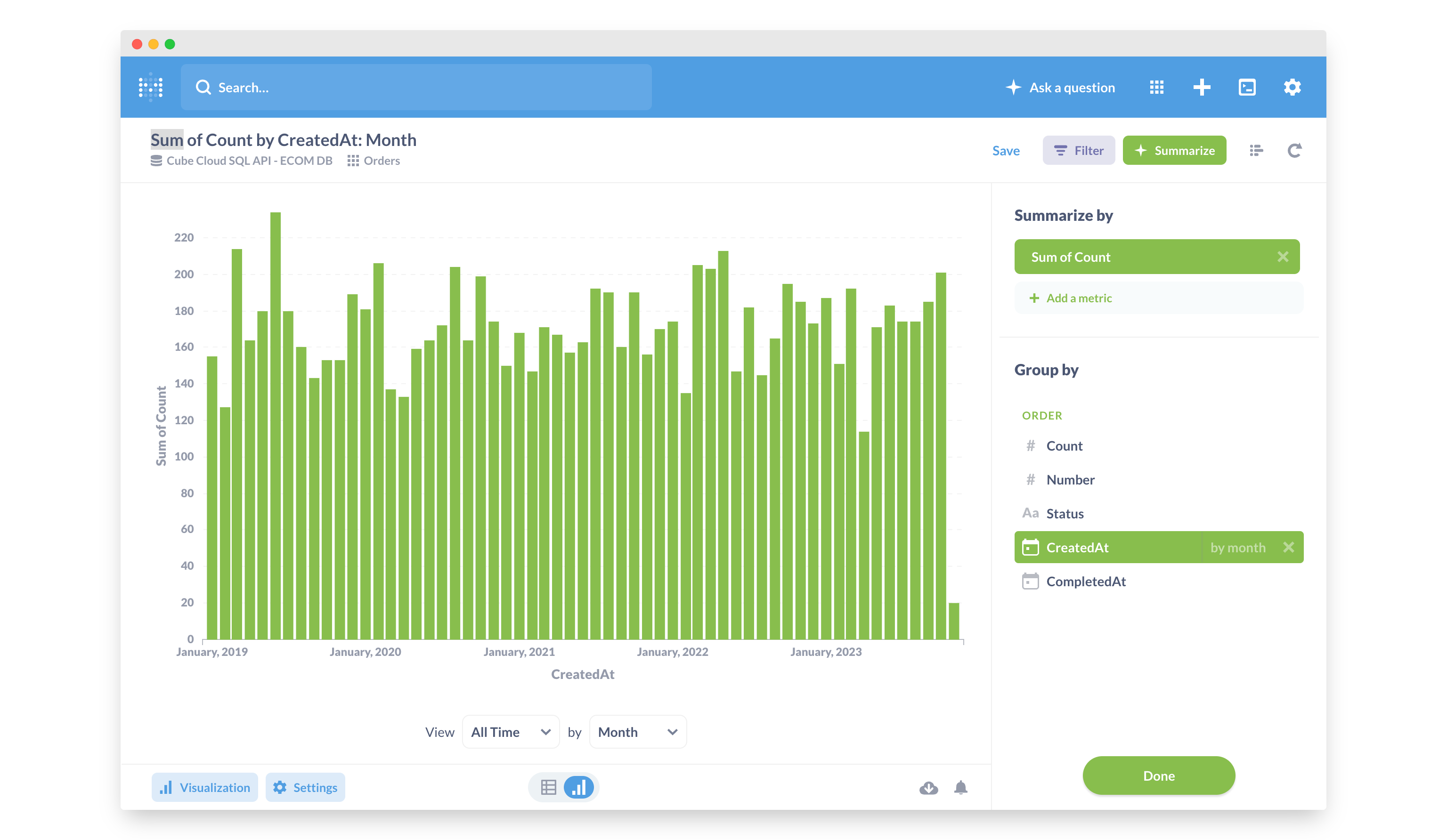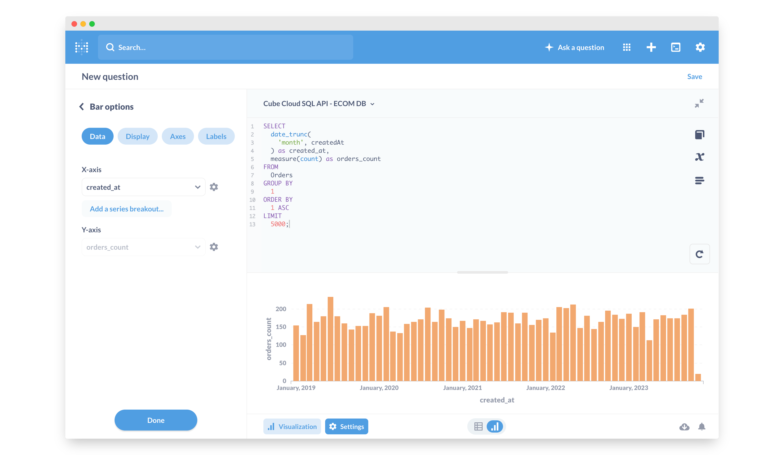 You can write SQL in Metabase that will be executed in Cube. Learn more about Cube SQL syntax on the reference page. You can also create a visualization of the executed SQL query.