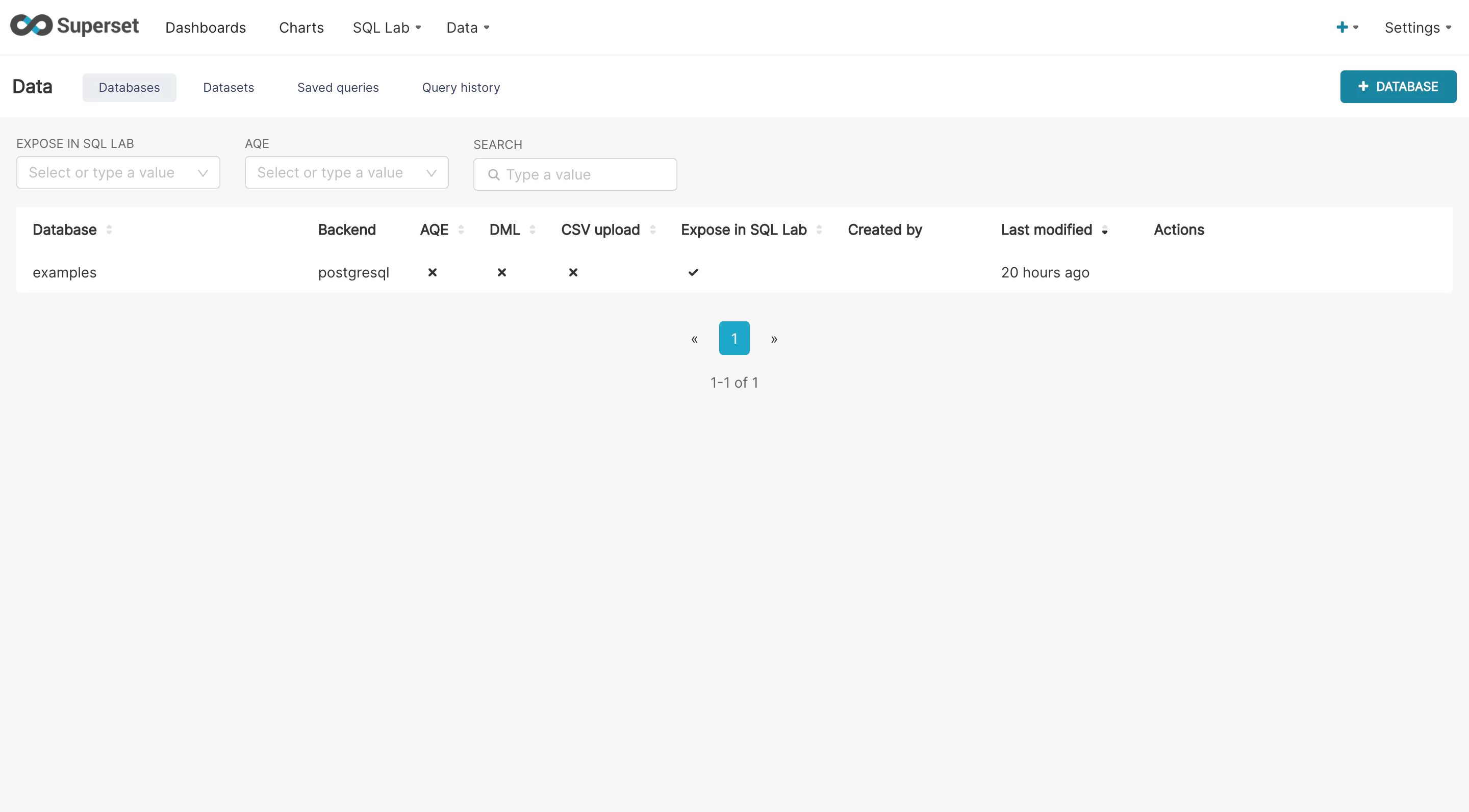 In Superset or Preset, go to Data > Databases, then click + Database to add a new database: