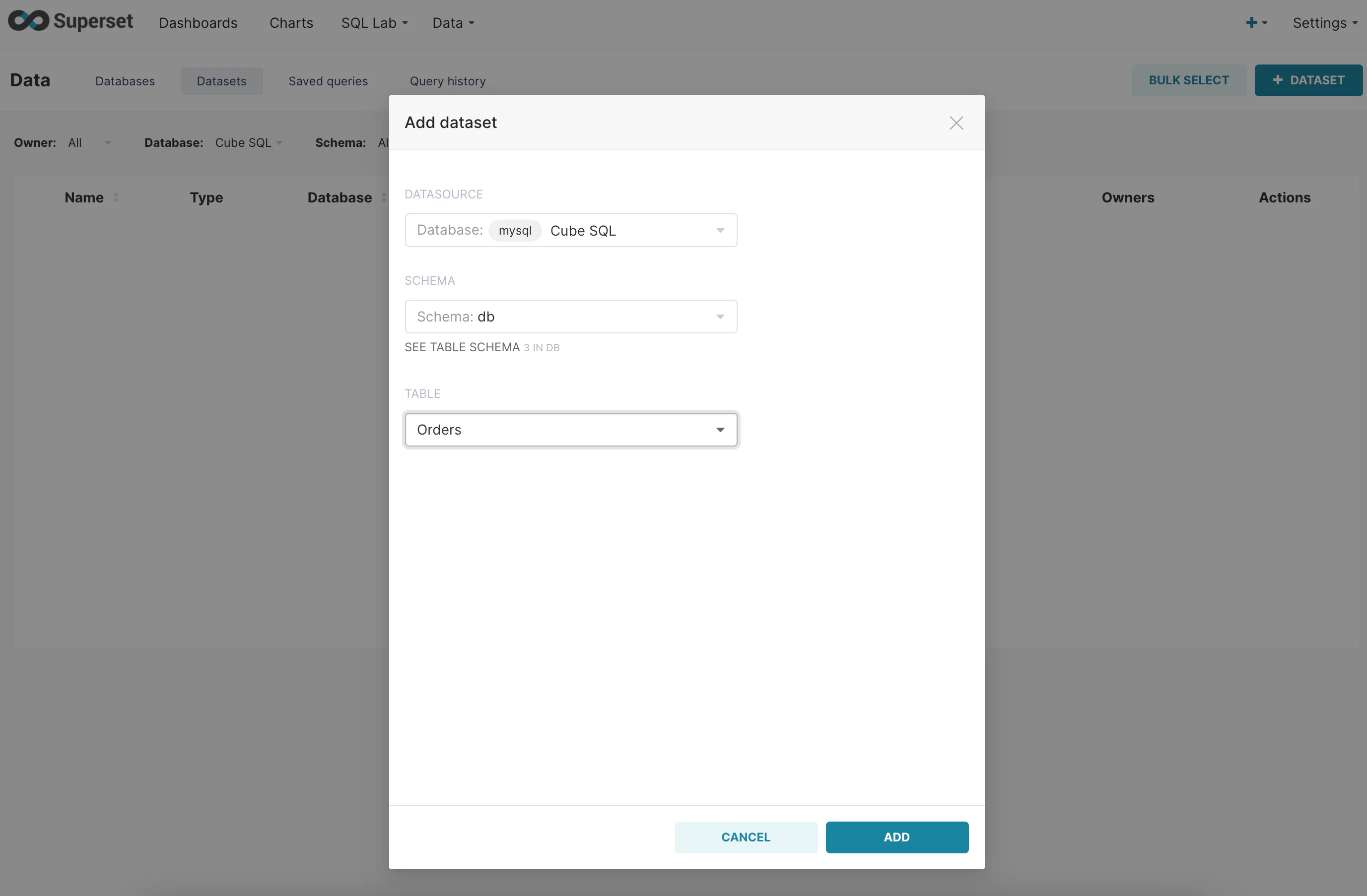 })Using the SQL API, orders will be exposed as a table. In Superset, we can